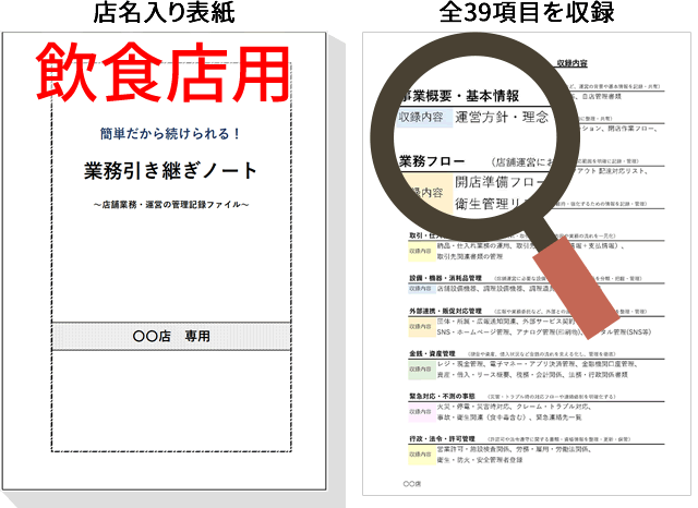 この「業務引き継ぎノート」は、日常の業務から事業の運営などの「誰もができる業務・運営」を見える化するためのものです。一方で、飲食店の味やレシピ、など “その店ならでは” の部分は、あえて記入対象にしていません。 命である味やレシピ部分は、紙ではなく「人から人へ」受け継がれるものだと考えています。
