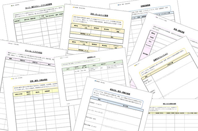 - 本業務引き継ぎノートは店舗運営上の実務を円滑にするためのツールであり、法的な手続きや税務相談に対する専門的な助言を提供するものではありません。必要に応じて専門家(税理士・社労士・弁護士等)に相談していただきますよう、お願い致します。